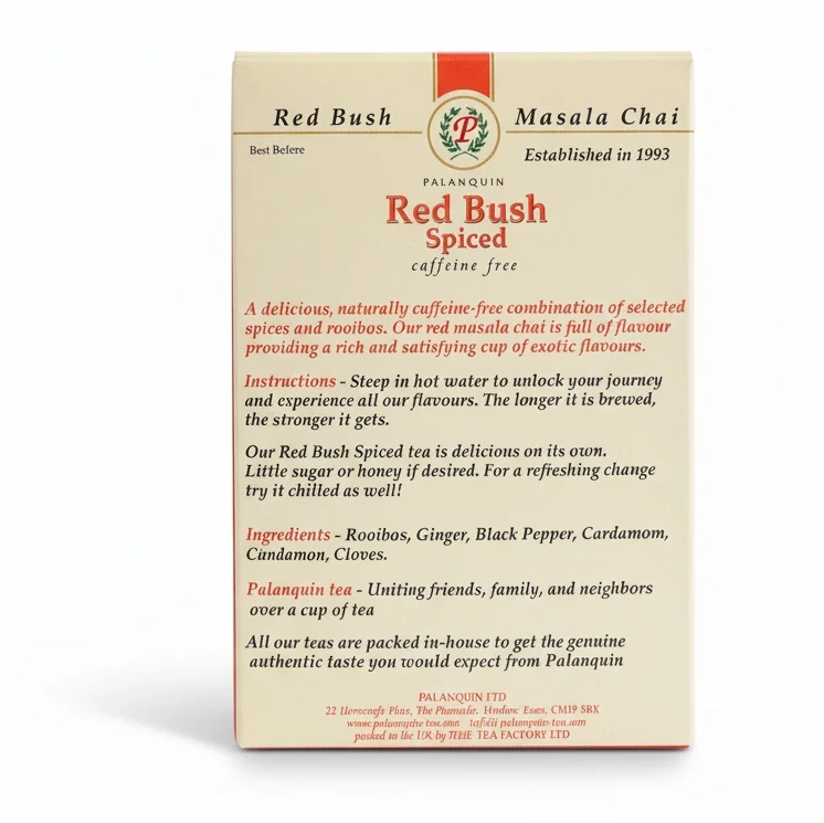 Immerse yourself in the rich, exotic flavours of Palanquin's Red Bush Spiced Tea. This naturally caffeine-free tea brings together a harmonious blend of rooibos and warming spices like cinnamon, ginger, cloves, black pepper, and cardamom, delivering a uniquely satisfying cup every time.