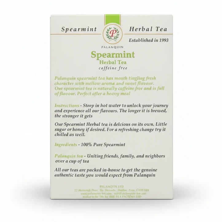 Enjoy a refreshing and soothing experience with Palanquin Spearmint Herbal Tea. Crafted from 100% pure spearmint, this herbal tea offers a mouth-tingling fresh character combined with a mellow aroma and sweet flavour, making it a delight for your senses.